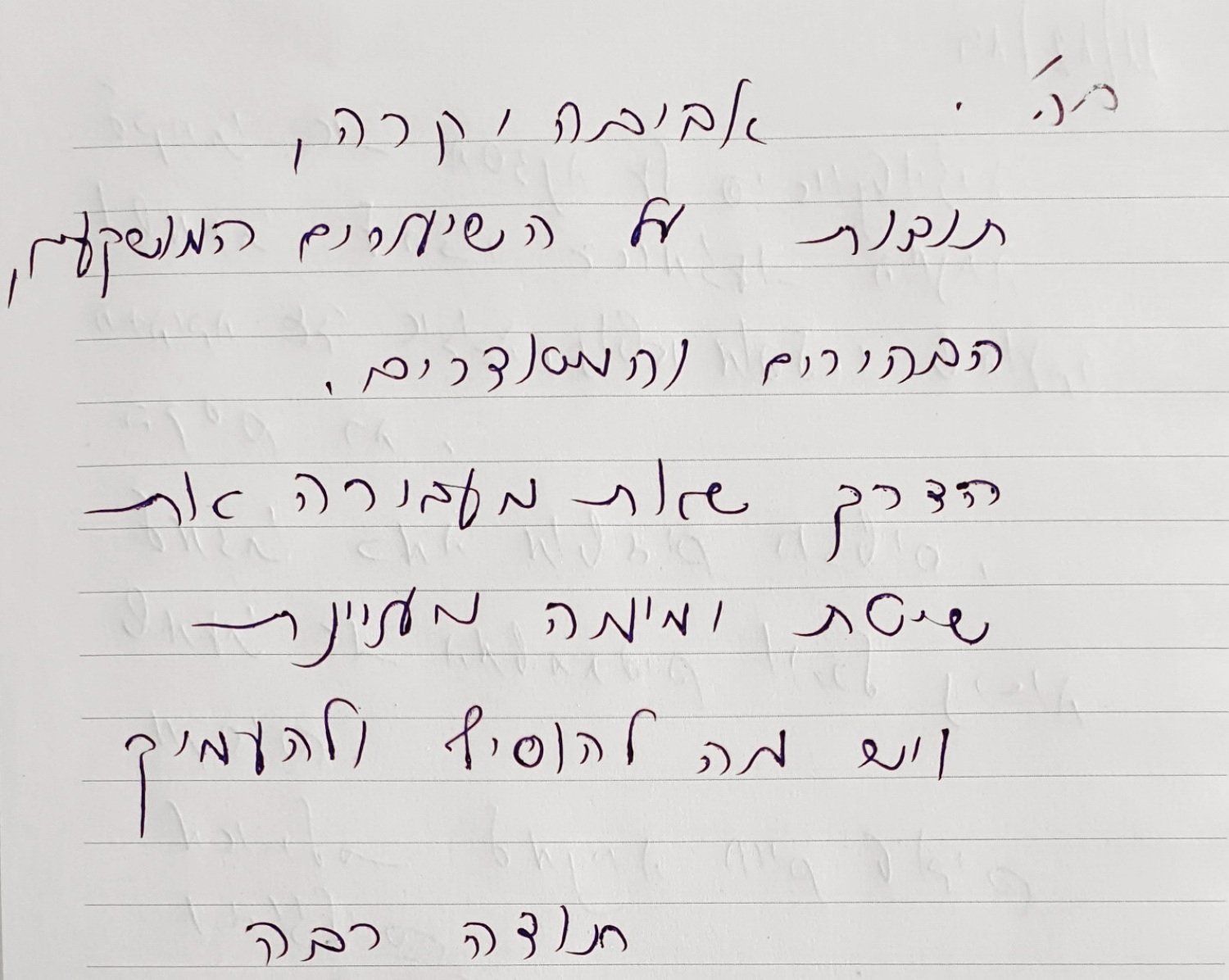 לאט אבל בטוח, תוך כדי פגישות שכללו צחוק, התרגשות ודמעות גרמת לי לדייק את עצמי ונטעת בי בטחון, אמונה ואופטימיות. עוררת אצלי רצונות פנימיים ולימדת אותי להבחין, להפריד ולהתמודד עם דפוסים מעכבים שהתקבעו.